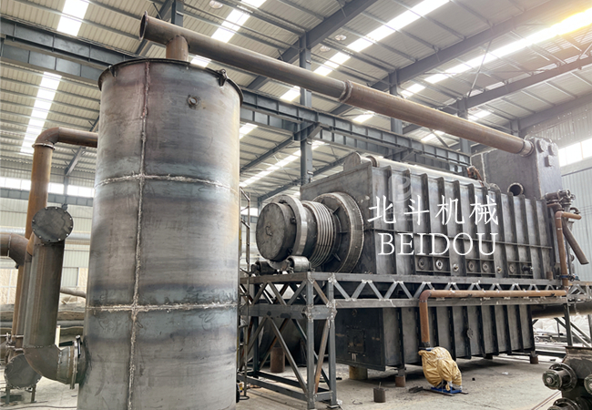 ?炭化主機(jī)為內(nèi)外圓筒嵌套結(jié)構(gòu),分為預(yù)熱段、炭化段和冷卻段。運(yùn)行時(shí),原材料先進(jìn)到內(nèi)筒開(kāi)展預(yù)熱和預(yù)炭化,隨后伴隨著炭化主機(jī)的旋轉(zhuǎn)進(jìn)到外筒,原材料直接在外筒中干餾炭化,炭化完成后由冷卻出料機(jī)送出。炭化主機(jī)選用變頻電機(jī),滾筒轉(zhuǎn)速可根據(jù)原材料的粒度、水分等因素隨機(jī)調(diào)節(jié),炭化溫度和時(shí)間可以控制。